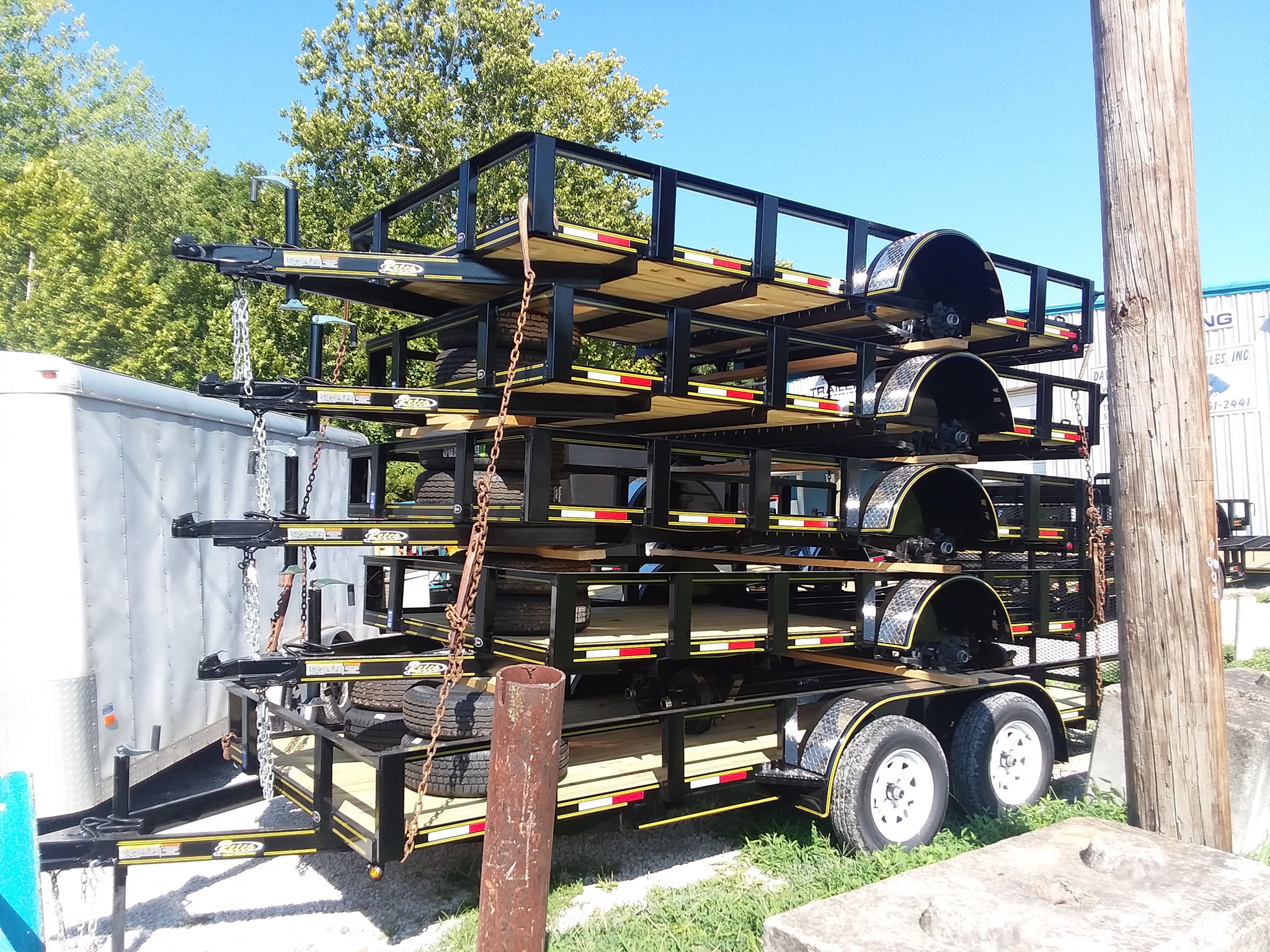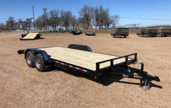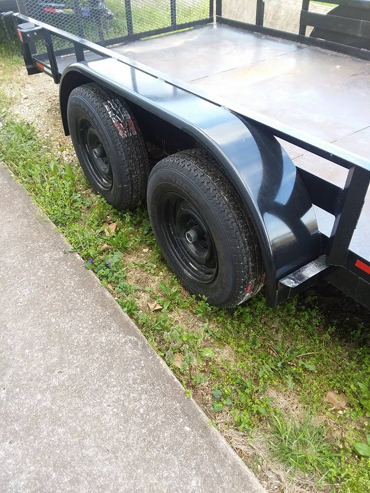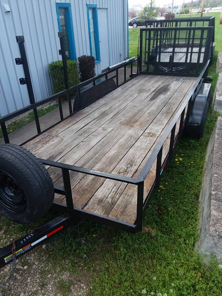 - 82×18 2019 trailer: Teardrop fenders, 2-3500lb. Axles, 5″ Channel frame, 4″ Channel tongue, Pressure treated floor, 2″ Atwood coupler, 2k Set back jack, Fender steps, Stake pockets & rubrail, LED seal beam tail lights, Aluminum gravel guard on front of fenders, New 15″ 10 ply tires on silver mod wheels, Marker lights in front corners & front fend steps, one break on one axle, break a way kit, foot pull out from the back, Reflector tape & 7 way round plug